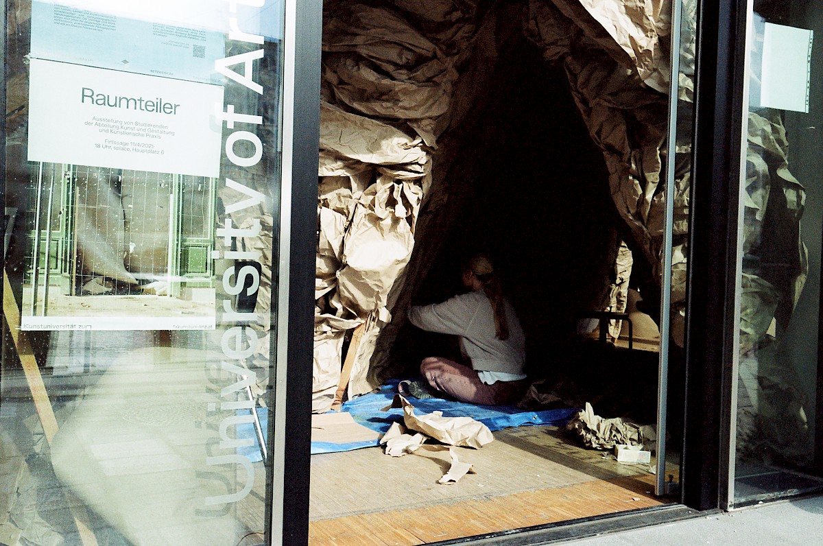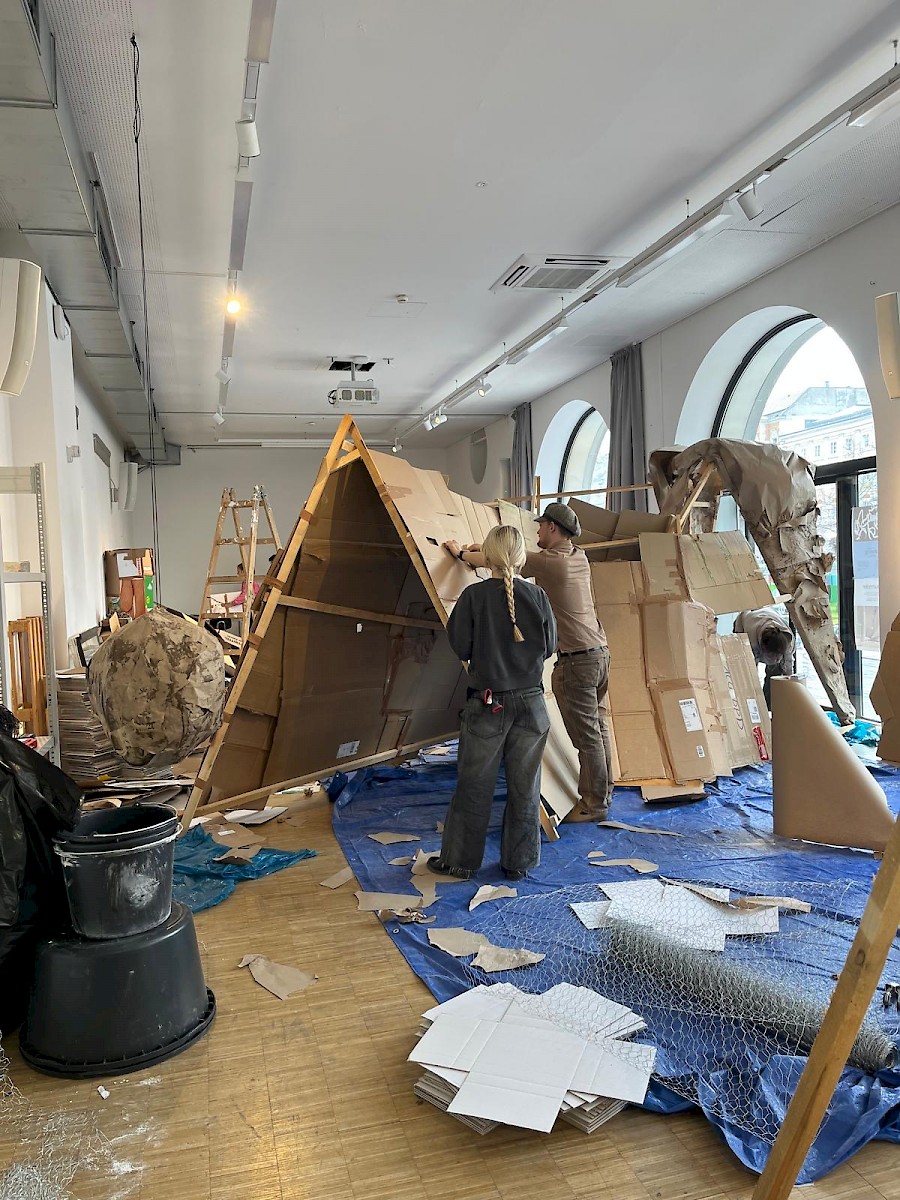 Gemeinsam verbrachten die Studierenden einige Tage im Splace, arbeiteten in kleinen Gruppen mit vorgegebenen Materialkontingenten. Nach einer Ausstellung am 11.04. wurden die Skulpturen zum Teil bei einer Parade in Gedenken an feministische Landverteidigerinnen zu öffentlichen Raumteilern umfunktioniert.